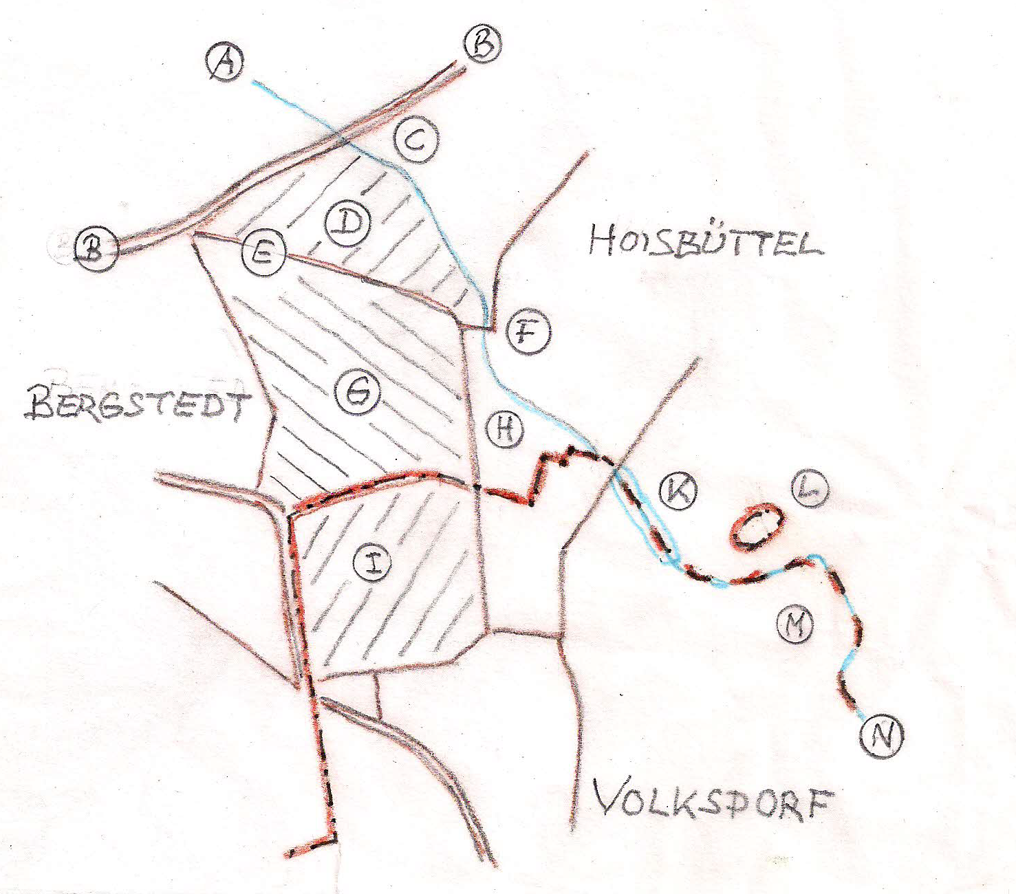 Dennoch wird protokolliert, das nördlich der Landstraße (12) Hamburg-Oldesloe (B) liegende Land (heute Ferdinand-Harten-Str,) gehöre zu Hoisbüttel, das südlich gelegene Land (Lottbeker Heide u. Wensenbalken) zu Bergstedt.