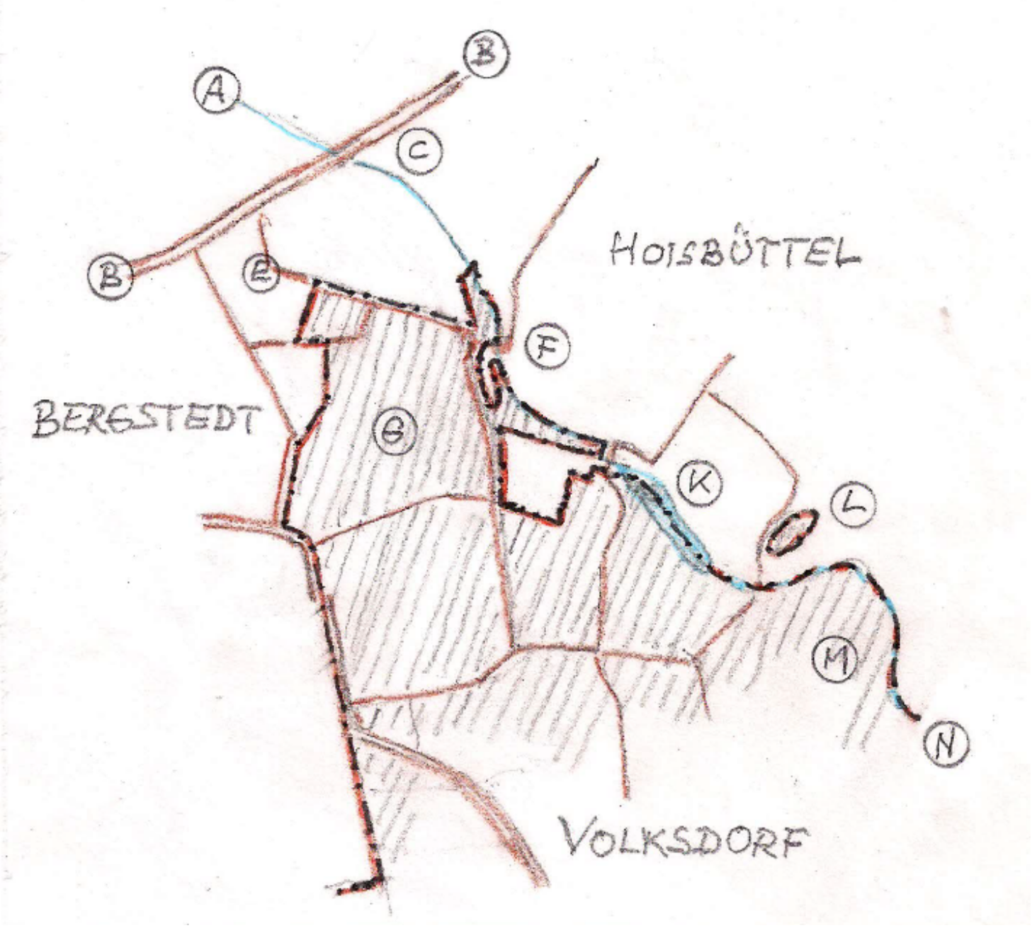 der Wensenbalken (G), der von Bergstedt beansprucht wird (8). Die Siedlung Wensenbalken liegt folglich auf ehemaliger Flur des untergegangenen Dorfes Lottbek.